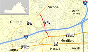 State Route 243 (SR 243) is a primary state highway in the U.S. state of Virginia. Known as Nutley Street, the state highway runs 1.70 miles (2.74 km) from U.S. Route 29 (US 29) and State Route 237 (SR 237) on the border between Oakton and Merrifield north to State Route 123 (SR 123) in Vienna. SR 243 connects Vienna and Fairfax with Interstate 66 (I-66) and the Vienna station of the Washington Metro.