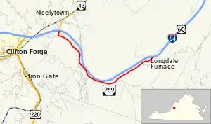 State Route 269 (SR 269) is a primary state highway in the U.S. state of Virginia. Known as Longdale Furnace Road, the state highway runs 6.80 miles (10.94 km) from Interstate 64 (I-64)/U.S. Route 60 (US 60), and SR 42 near Nicelytown east to I-64/US 60 at Longdale Furnace. SR 269 forms part of the old alignment of US 60 in eastern Alleghany County.