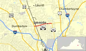 State Route 356 (SR 356) is a primary state highway in the U.S. state of Virginia. Known as Hilliard Road, the state highway runs 1.43 miles (2.30 km) from U.S. Route 33 (US 33) in Dumbarton east to SR 161 in Lakeside in central Henrico County.