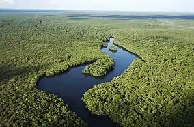 The Viruá National Park is in the Caracaraí municipality of Roraima.[2] It has an area of 241,948 hectares (597,870 acres).[3][lower-alpha 1] The main river is the Viruá Igarapé, a blackwater river with little sediment, which flows into the Anauá River along the southern limit of the park. The Anauá in turn feeds the Branco River, which forms the western boundary of the park.[4] The Caracaraí Ecological Station and Niquiá Ecological Station lie along the opposite shore of the Branco River. The park adjoins the Baixo Rio Branco-Jauaperi Extractive Reserve to the south and the Anauá National Forest to the southeast.[5]