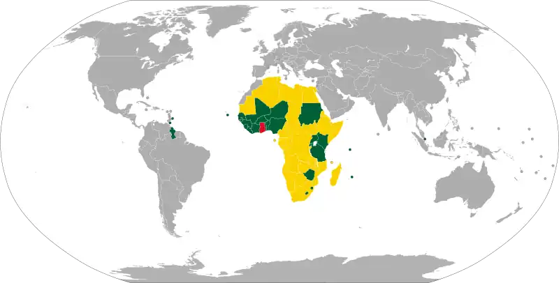 Citizens of the following countries and territories are not required to obtain a visa to enter Ghana, for a stay up to the duration listed below:[1][2]