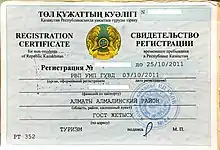 - ↑ "About introduction of amendments to the resolution of the government of the Republic of Kazakhstan of January 21, 2012 No. 148 "About the approval of Rules of entrance and stay of immigrants in the Republic of Kazakhstan..."". egov.kz. Retrieved 8 April 2018.