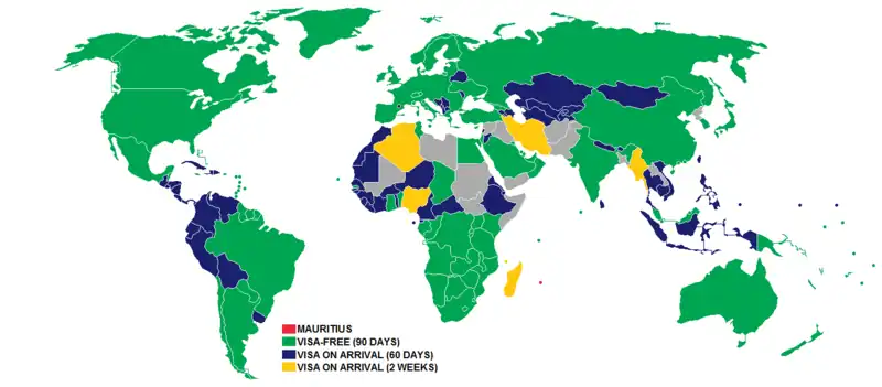 Most visitors to Mauritius are visa exempt or can obtain a visa on arrival. However, some countries must obtain a visa in advance before being allowed into the country.[1][2]