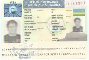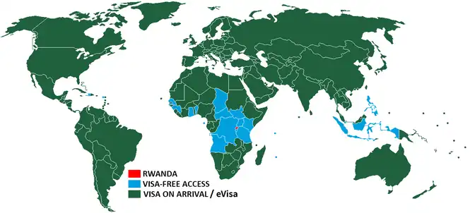 The Republic of Rwanda, a member of the East African Community, allows citizens of all countries that are not visa exempt to obtain a visa on arrival. In addition, they may also obtain an e-Visa online before departure.[1] All visitors must hold a passport valid for at least six months with at least one empty page. Kenyans and Ugandans may use an ID card in lieu of a passport to enter Rwanda.[2]