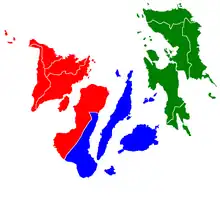 - ↑ On May 23, 2005, Palawan and Puerto Princesa City were moved to Western Visayas by Executive Order No. 429.[4] However, on August 19, 2005, President Arroyo issued Administrative Order No. 129 to hold the earlier E.O. 429 in abeyance pending a review.[5] As of 2010, Palawan and the highly urbanized city of Puerto Princesa still remain a part of the Mimaropa region.