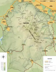 Vitosha (Bulgarian: Витоша [ˈvitoʃɐ]), the ancient Scomius or Scombrus,[1] is a mountain massif, on the outskirts of Sofia, the capital of Bulgaria. Vitosha is one of the symbols of Sofia and the closest site for hiking, alpinism and skiing. Convenient bus lines and rope ways render the mountain easily accessible. Vitosha has the outlines of an enormous dome. The territory of the mountain includes Vitosha nature park that encompasses the best known and most frequently visited parts. The foothills of Vitosha shelter resort quarters of Sofia; Knyazhevo quarter has mineral springs. Vitosha is the oldest nature park in the Balkans. The mountain emerged as a result of volcanic activity and has been subsequently shaped by the slow folding of the granite rock layers and a series of gradual uplifts of the area. It appears dome shaped at first sight, but the mountain, 19 km long by 17 km wide, actually consists of concentric denudational plateaus rising in tiers one above the other. Vitosha is separated into four main parts whose main ridges gather at a crown known as Cherni Vrah ('Black Peak', Bulgarian: черни връх). This is the highest point of the mountain at 2290 m and is one of 12 peaks of Vitosha over 2000 m in height. It is the highest massif of Srednogorie mountain chain system, together with Sredna gora, Plana (mountain), Lyulin Mountain, Greben (mountain), Viskyar Mountain, etc. They all are a result of the folding of the earth layers through the Mesozoic, causing also magma sheet-like intrusion (or concordant pluton) that has been injected between layers of sedimentary rock. The laccolithic domed form of Vitosha is a typical example.