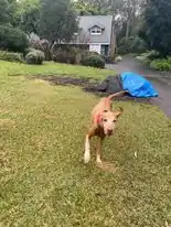 The Vizsla holds its tail horizontal to the ground and wags it vigorously while charging through rough scrub and undergrowth.