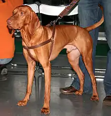 The Hungarian Vizsla (Hungarian: [ˈviʒlɒ])[lower-alpha 1] is a dog breed from Hungary and belongs to the Federation Cynologique Internationale (FCI) group 7 (Pointing Dogs),[3] the Canadian Kennel Club (CKC) group 1 (Sporting group),[4] and the American Kennel Club (Sporting group).[5] The Hungarian or Magyar Vizsla or Smooth-Haired Vizsla are sporting dogs and loyal companions. The Vizsla's medium size is one of the breed's most appealing characteristics. As a hunter of fowl and upland game, the Vizsla has held a prominent position among sporting dogs that of household companion and family dog.