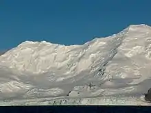 Vladaya Saddle from Bransfield Strait, with St. Methodius Peak to the left, St. Cyril Peak to the right, and Prespa Glacier in the foreground.