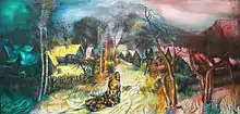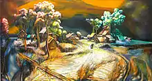 Twenty years brought 'The Island' both worldwide recognition for some individual artists, and also notable losses. One of the most vivid members of the group, the legendary personality of the St Petersburg Bohemia of the 1990s was the artist Vladimir Lisunov. Strikingly handsome, he felt linked by blood with the St Petersburg Silver Age, and always wore a full-length fox fur coat and a wide-brimmed romantic hat. In his pictures Venuses swung on swings, strange philosophizing people wandered around fantastical and slummy cities, his winter scenes exuded longing for his native outskirts of the Leningrad region, in them thoughtful animals, wistful and cosy, and lost country folk came to the foreground. A short documentary film was made about Lisunov when he was alive, in which he recites his convoluted, passionate poetry, talks about his love of fishing, and some kind of morose nuclear energy wafts from the film, and it is clear that Petersburg in the perestroika of the 1990s was the kind of concentration of spirit and creativity which only happens once in a hundred years. Vladimir Lisunov was mysteriously killed by an unknown assailant in 2000. A wave of mysterious killings of artists swept through St Petersburg at the time, as if the city was ridding itself of its already fading stage of turbulent underground , making the transition to a new life, to the gibbering, insipid 2000s.[3]