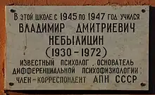 Vladimir Dmitrievich Nebylitsyn, Russian: Владимир Дмитриевич Небылицын (1930, Chelyabinsk region — 1 October 1972, near Adler) was a Soviet psychologist, one of Boris Teplov's disciples, professor (1968), associate member of the Russian Academy of Pedagogy.
