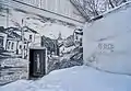 During four summer seasons (2002-2005), Ovchinnikov, a self-taught artist, made about a hundred paintings[5] on the houses of Borovsk, creating on the dull blank walls of city buildings, boarded-up windows, fences, about 90 different subjects (his famous countrymen, churches, historical events, genre scenes: a girl walking on the pipe of a pipeline, an old woman with a bucket near a downspout, a naked boy knocking at the locked door, a man with a giant cucumber in the hands, an old man in his window reading «Times», etc.). Themes are chosen and selected with the help of his wife. Many of the paintings are accompanied by poems written by Elvira.