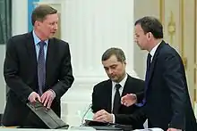 Surkov on his last day as deputy prime minister in a meeting with Sergey Ivanov (Chief of Presidential Staff) and his ministerial colleague Arkady Dvorkovich