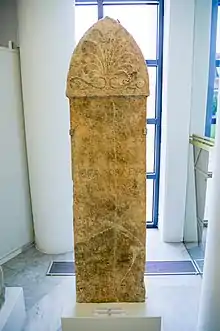 In total 13 inscriptions have been published from the area of Vlochos.[2]:1–8[20] The oldest is an early Classical dedication to Poseidon by Kinon, an archegetes, written in the local Thessalian alphabet. The inscription was found during roadworks in the 1930s, and is presently exhibited at the Archaeological Museum of Almyros.[21]:16–18 An additional four dedications to unknown deities was found during rescue work in the 1960s, ranging from the early 4th to the 3rd century BC. Three funerary stelai have been recovered from the fields south of the ancient city, all of the 3rd or early 2nd century BC. Two, those of Megalokleas and Nikasippos son of Nikias, are displayed in the foyer of the Archaeological Museum of Karditsa.[22]