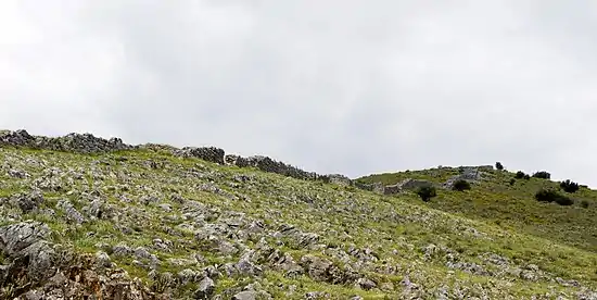 A section of the easternmost preserved stretch of fortification walls at the site bear clear signs of having been repaired at a significantly later date than its 4th century BC original construction.[10]:258–259[4]:160–162 The repairs can stylistically be dated to the early Byzantine period, and includes two additional towers.[1]:52 The fortifications deviate from the second phase wall at the foot of the hill, to follow the curvature of the terrain along the slope. The wall of this phase is considerably thinner than that of its predecessors, being only 1.65 m wide, and is constructed in un-tooled stones joined with mortar.[1]:47