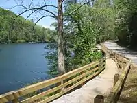 The park features four hiking trails, covering a wide variety of conditions, forest habitats and difficulties.[12] These include the moderate difficulty 4-mile (6.4 km)-long Bear Hair Gap Trail marked by green blazes. It begins and ends in Vogel, although most of the trail loops through the Chattahoochee National Forest.[13] The park also features a 1-mile (1.6 km) Trahlyta Lake Loop Trail and the Byron Herbert Reese Nature Trail (.8 miles).