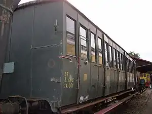 These cars disposed of an indestructible chassis below a wooden frame and equipped with a door for each compartment. The cars were built from 1902 to 1927 by the Chemins de Fer de l'Ouest (later incorporated in the Chemins de Fer de l'État) for use on omnibus and intercity services of the company. 488 cars were modernised from 1952 to 1961 with a replacement metallic frame in replacement of the wooden one as well as the construction of a central corridor. Only a very few coaches remain in preservation, most of which at Pont-Erambourg.