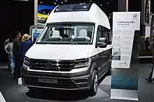 At the International Motor Show 2017, a VW California XXL concept was presented, based on the VW Crafter. The 6.2 m (20 ft) long vehicle has an interior standing height of 2.2 m (7 ft 3 in) and is equipped with underfloor heating. The series model VW Grand California went on sale in 2019.[2]