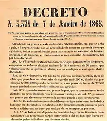 Deprived of war resources, without a sufficiently numerous and trained army and unable to adequately retaliate for the Paraguayan offense received after the invasion of Mato Grosso in December 1864 (before formal declaration of war, which happened on 13 December 1864), emperor Pedro II issued the Decree No. 3,371 on 7 January 1865;[4] This decree, appealing to the patriotic feelings of the Brazilian people, created military corps for the service of war, with the denomination of Voluntários da Pátria.[4]