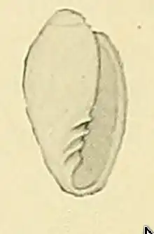 (Original description) The very small shell is oviform, semitransparent. It has a short spire, axially finely striated. The sculpture consists of minute, close, and straight axial striae, continuous over the spire to the body whorl. The colour of the shell is white or yellowish white. The spire is short, conoidal and with a blunt apex, its height about one- fifth that of the aperture. The protoconch is smooth, andbroadly convex. The shell contains three whorls, flat on the spire. The body whorl is high, moderately convex and slightly narrowed towards the base. The sutnre is indistinct. The aperture is high and narrow, a little wider below, subchannelled above and roundly truncated at the base. The outer lip is slightly convex, vertical, a little retrocurrent toward the suture, thickened and rounded. It is smooth inside, with an outer varix extending a short way up the spire and across the basal margin. The columella is a little oblique and has four oblique, nearly equidistant, strong plaits. The inner lip is broad and thin, distinct only outside the columella. The parietal wall is lightly convex.[2]