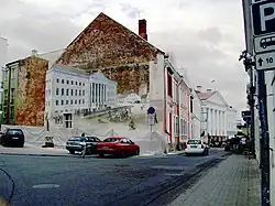 Today the building is still owned by the university and in 2006 to 2007 the building was renovated under the managemement of Merje Müürisepp. Müürisepp had the facade restored to light yellow and the rest of the building painted a dark pink. A vast external mural was constructed on the side of the house. The mural was a reproduction of a lithograph by Louis Höflinger who had lived in Tartu around 1860.[1] The Art Museum of Estonia has a large collection of his work.[9] The design was prepared by Maarja Roosi. The mural shows the main building of the University of Tartu exactly as it was recorded in 1860 by Höflinger. It was constructed by students under the supervision of university staff.[1]