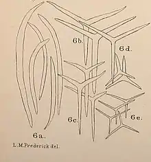(4) Subgastral sagittal triradiates (PI. 26. fig. 6 b); very large and stout, rays conical, gradually and sharply pointed, oral rays often slightly curved or crooked, basal ray (centrifugally directed) longer than orals; oral rays measuring, say, 0.41 by 0.04 mm., with basal 0.52 by 0.'05 mm., but variable.
