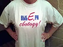 - ↑ The shirt reads "Выбери свободу!", or "choose freedom!". The "Е" is capitalised as part of Yeltsin's surname in Cyrillic (Ельцин).