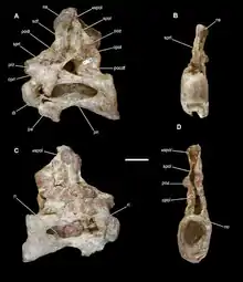 Also, two "local" autapomorphies were identified, that distinguished Vouvria from its nearest relatives in the Brachiosauridae. In the front tail vertebrae both the anterior centrodiapophyseal lamina (ACDL) and the posterior centrodiapophyseal lamina (PCDL), ridges that run on the front underside, respectively the rear underside, of the transverse process towards the vertebral body, are well-formed. The humerus or upper arm bone, has a deltopectoral crest, serving for the attachment of the musculus deltoideus and the pectoralis major, that doubles in transverse width to below.[4]