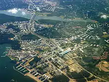 Vuosaari is a peninsula on the shore of the Gulf of Finland, with an area of 17 square kilometres. There are many large greenspaces on both the northern and the southern parts of the area. The district also includes numerous small islands in front of the peninsula, such as Pikku Niinisaari, Iso Villasaari and Kalliosaari.[9]: 184 [10] The Vartiokylänlahti bay to the west of Vuosaari and the Porvarinlahti bay to the north are remnants of an ancient strait which has dried up because of tectonic uplift.[1] The Kangaslampi lake, about a hectare in size, is located in the northern part of Keski-Vuosaari and is one of the few lakes located inside Helsinki. The soil in the middle of Vuosaari is mostly made of sand, whereas the lands in the eastern and western parts are made of till, cliffs and clay at some parts. The dominant mineral in the bedrock is gneiss, but there are also more rare minerals in the area, such as gabbro and pillow lava formed from ancient undersea volcanic activity.[11]