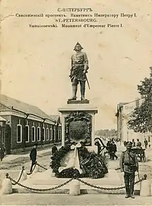 Vyborgski district has preserved a certain tangible memory of the nation's success in the Great Northern War. The day of the decisive Battle of Poltava in the south (in what is now Ukraine), on which Russians had their first major success in the war, fell on the feast day of Saint Sampson the Hospitable[4] (June 27, 1709), and a grand cathedral in his honour was built on the road to Vyborg. Completed during the reign of Anna of Russia, Sampsoniyevskiy Sobor (Saint Sampson's Cathedral) is now a museum - a branch of the ring of four museum churches with the head office at Saint Isaac's Cathedral.[5] Saint Sampson's Cathedral features among the few church buildings preserved from the first half of the 18th century - from the city's first decades of existence.[6] It replaced an earlier wooden church, whose construction started in 1709 on the Tsar's order, and which was consecrated the following year. The cathedral is interesting architecturally for its admixture of Old Russian forms with then-current elements of Western European trends, forming together "Anna's baroque" and is also known for its unique carved wooden iconostasis from that time.[6] For the bicentennial of the Battle of Poltava the ground floor of the bell tower was decorated by memorial plaques citing Peter's selfless encouraging words to his army on the day.[6] Opposite the building was placed Peter the Great's statue by Mark Antokolsky, taken away under Soviet rule years and restored on its place in the early 21st century.