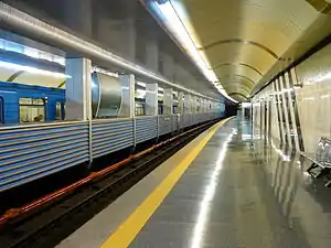 The station is by far the most unusual in the system. Its design is a shallow level curved side-platform pillar bi-span. In the original designs the station was not planned, and the long stretch Kharkivska-Boryspilska was already under construction, when in late 2003, the City urban planning committee decided to invest and develop the empty area roughly halfway between the two stations with new housing massifs.[1] As a result, a need for a Metro station arose. In fact, the only other station in the former USSR to exhibit the same layout is Alexandrovsky Sad on the Moscow Metro whose design was too attributed to the same reasoning.