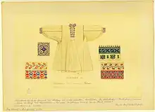 Vyshyvanka (Ukrainian: вишива́нка [ʋɪʃɪˈʋɑnkɐ] or виши́ванка [ʋɪˈʃɪʋɐnkɐ];[1] Belarusian: вышыванка, romanized: vyšyvánka) is a casual name for the embroidered shirt in Ukrainian[2][3][4][5] and Belarusian[6][7][8] national costumes. Ukrainian vyshyvankas are distinguished by embroidery features specific to Ukrainian embroidery.[3]