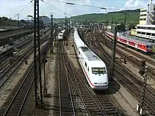 To meet the increasing performance requirements for the construction of the new line and the third track to Rottendorf, the west end of the station was completely rebuilt and the east end was partially rebuilt.[6] In 1984, a new signal box was into operation.[13] From 1989[14] until 1999, the station entrances were extensively remodelled. The performance of the node was improved by the installation of slimmer sets of points and improvements to the signalling systems. The track upgrade supported an increase in speeds from 40 to 60 km/h (25 to 37 mph) at the east end and from 60 to 80 km/h (37 to 50 mph) at the west end. The exit for the high speed line can be operated at 100 km/h (62 mph). Moreover, the traffic flows were designed so that trains would run at the entrance and exit largely without crossing paths and freight operations are concentrated on the south side of the station. These measures have substantially increased the capacity of the tracks and operations can now be handled with less noise. The travel time savings for long-distance operations is about two minutes and in conjunction with improvements to the Nuremberg–Würzburg line about seven minutes. The cost of the upgrade amounted to about DM 115 million (about €60 million).[15] As early as 1988 to 1991, the upgrade on the eastern end had raised speeds from 40 to 60 km/h (25 to 37 mph).[16]