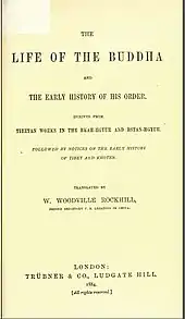 The Rockhills sold the ranch in 1881 and moved to Montreux, Switzerland, where William's mother lived.[3] He spent the next three years in Europe studying Tibetan, Sanskrit, and Chinese.[2] During this period, he co-authored a biography of the Buddha with Nanjo Bunyu and Ernst Leumann, and completed a French language translation of the Prātimokṣa sūtra, published in 1884 under the title Prâtimoksha sutra; ou, Le traité d'émancipation selon la version tibétaine: avec notes et extraits du Dulva (Vinaya).[2]