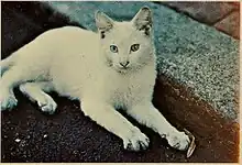 Domesticated cats with blue eyes and white coats are often completely deaf.[54] Deafness is far more common in white cats than in those with other coat colors. According to the ASPCA Complete Guide to Cats, "17 to 20 percent of white cats with non-blue eyes are deaf; 40 percent of "odd-eyed" white cats with one blue eye are deaf; and 65 to 85 percent of blue-eyed white cats are deaf."[55] Although few studies have been done to link this to genes known to be involved in human Waardenburg syndrome, a genetic disruption to neural crest development would lead to this presentation in cats as well.[56] One of the genes that leads to deafness and a white coat in cats when mutated, KIT,[57] has been found to increase MITF expression.[58]