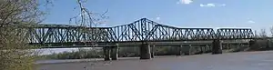 In 1936, the current Wabash Bridge was built about half a mile upstream from the old bridge, and the old bridge was demolished.[3] In June 2013, the Missouri River rose rapidly overnight causing a crane mounted to a barge to collide into the truss structure of the bridge. The crane, subcontracted by The Walsh Group was working up river on the new I-70 Blanchette Memorial Bridge. Train traffic across the bridge was halted for the four days while the crane was against the structure. In 2016, owner operator Norfolk Southern Corporation began installing a new tie deck across the bridge with a completion date of 2020.