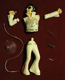 Wackel-Elvis was designed to portray musician and actor Elvis Presley around the time of the early 1970s. The dress of Wackel-Elvis resembles the white jumpsuit Elvis Presley wore in the 1973 Aloha from Hawaii television satellite broadcast. Other than most conventional bobblehead dolls, in which a flexible neck joint connects a wobbling head to a static figure that rests on a surface, Wackel-Elvis is attached to the inside of the windshield or rear window of a vehicle. The figure is suspended from a suction cup connecting to an adjustable elastic string which, at its other end, is attached to a loop on top of the head of the figure. On a sharply pointed nail, protruding approximately .2 inches (5 mm) from the sole of the right foot of the figure, Wackel-Elvis stands on top of the dashboard or rear cargo cover. With the vehicle in motion, the left arm stretched away from the body of the figure produces centrifugal force, causing the figure to spin back and forth around its vertical axis. While spinning, the foot of the figure is held in place by the nail and its head held in place being suspended from the string. The left arm and hip of Wackel-Elvis wobble consistent with the vehicle motion, creating the illusion of Elvis Presley performing or dancing on stage.