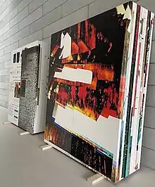 Recently I've been using Epson inkjet printers and flatbed scanners as tools to make works that act like drawings, paintings, even sculptures. I spend a lot of time with books and so logically I've ended up using pages from books as material- pages torn from books and fed through an inkjet printer. I've been using a very pared down vocabulary of simple shapes and letters drawn or typed in Microsoft Word, then printed on top of these pages from catalogues, magazines, posters- and even blank canvas. The resulting images aren't exactly what the machines are designed for - slick digital photographs. There is often a struggle between the printer and my material - and the traces of this are left on the surface: snags, drips, streaks, mis-registrations, blurs.[7]