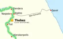 The Hammamat route ran from Qift (or Coptos), located just north of Luxor, to Al-Qusayr on the coast of the Red Sea. Qift was an important center for administration, religion, and commerce. The cities at both ends of the route were established by the First Dynasty, although evidence of predynastic occupation also has been found along the route.[2]