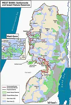 In the 1970s Israel began deep drilling in the wadi area with its rich groundwater resources and one consequence was that many springs and wells used by local Palestinians dried up.[4][29] In 1978 it began to establish Israeli settlements on the high banks on either side of the wadi. According to B'Tselem, Karnei Shomron was set up in that year on lands confiscated from four Palestinian villages: Jinsafut, Deir Istiya, Kafr Laqif and Hajjah, while Immanuel was established in 1983 taking 951 dunams from Deir Istiya, and, in establishing Sha'ar Emmanuel (1981) 159 dunams were confiscated from Immatain.[30][31] To the south, both Yaqir (1981) and Nofim were established on territory was appropriated from Deir Istiya.[32] After the Oslo Accords (1993 and 1995) and the establishment of the Palestinian National Authority (PA), the central sector of the wadi, east of Qalqiliya, became part of Area C, and was mostly owned by the villagers of Deir Istiya.[4] Later, further illegal outposts such as Alonei Shilo (1999), Yair Farm (1999) and El Matan (2000) were set up in the wadi zone.[4] All of these settlements discharged their sewage waste waters into the Wadi Qana stream, contaminating its use for Palestinian irrigation, until the recognized settlements were connected to the sewage system in 2006. The illegal Israeli outposts of Alonei Shilo and El Matan however continue to pollute the stream by discharging their wastewater directly into it.[4][33] Palestinian villages nearby add to this pollution by using cesspits whose contents are then randomly discharged into open areas and valleys near the wadi's springs.[34] In 1995 it was estimated that Yaqir, Karnei Shomron, and Immanuel alone annually generated approximately 908,700 cubic meters of wastewater directly into the Wadi.[35] This combination of polluting discharges from settlements,[4] and the reduced water flow caused by Israeli drilling undermined the traditional exploitation of its waters for irrigating vegetable crops, and forced some 50 families resident in the wadi to shift out, moving to Deir Istiya.[4] The plan of Israel's "Separation Barrier" cuts out Deir Istiya from the wadi, leaving it on the 'Israeli' side of that sector of the West Bank. When the Kana Stream Restoration Authority (2006) was inaugurated, one of its purposes, according to leaders of the settlement councils, was to block what they regarded as attempts by 'Palestinian elements' to assume control of the wadi's stream.[4] Since 2005 an annual spring walk takes place under the auspices of the Karnei Shomron Council. During the walk, local Palestinians, including landowners, are not permitted to access the wadi. Further projects, with large investments from the Israeli government and the Jewish National Fund, aim at developing it as a major Israeli tourist site.[4] That part of the wadi's village lands lying in Area C may not, under the Israeli dispensation, be used for Palestinian commercial or industrial projects: The one remaining option of using it for agricultural purposes – planting olive trees, for example, is, however, hampered by severe restrictions imposed by the Israeli authorities on the grounds that such activities damage the wadi's natural flora, the topography, and the character of the habitat.'[4] On 23 May 2021, around 15 settlers, escorted by some 5 Israeli soldiers, herded about 60 cattle into the area to graze them there. When Wadi Qana's farmers who own fields and groves there protested, they were pepper-sprayed and clubbed by settlers and one was rifle-butted by a soldier. Those not injured were prevented from leaving the valley until late at night. On returning to their homes, they found 4 of their cars damaged.[36]