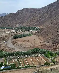 The wadi runs from the mountains down to meet the coastal city of Khor Fakkan on the Gulf of Oman and is dammed above the restored heritage village of Najd Al Miqsar by the Al Rafisah Dam,[1] a popular tourist spot. Below the dam is the restored hillside heritage village and fort of Najd Al Miqsar. The fort at Najd Al Miqsar formed part of a connected series of fortifications protecting Khor Fakkan, including the Al Rabi Tower and the Al Adwani Tower.[2]