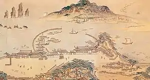 Unlike the Ming Dynasty's policy of haijin (restricting maritime trade), Korea permitted free entry of ships into its ports. As a result, trade between the Joseon and Japanese feudal lords increased rapidly. When Joseon harbors became targets for wokou pirates, in 1407, King Taejong restricted Japanese ships to the ports of Busan, Naei, and Yeom.[1] By 1410, all forms of Japanese communication, including entrance of envoys and messengers, known to Koreans as Chŏbwae (접왜; 接倭), were also restricted to these ports. Originally intended only as a stop for Japanese ships, these ports soon became hotspots for Japanese residents and their families, primarily arriving from Tsushima Island, forming the first waegwan ethnic enclaves, the sampo (삼포; 三浦; lit. three ports).[1][2]