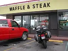 For years, Waffle House was known as "Waffle and Steak" in Indiana due to another chain of restaurants owning the rights to the Waffle House name in the state.[23][24] The original Indiana Waffle House chain has started using the name "Sunshine Cafe".[25] However, the d/b/a for "Sunshine Cafe" belongs to "Waffle House Greenwood Inc.", established in 1981. The oldest "Waffle House" entity listed with the Corporations office of the Indiana Secretary of State is "Waffle House of Bloomington, Indiana, Inc." established in 1967, and like Waffle House Greenwood, it is still an active corporation.[26] The Bloomington operation, the city's second oldest restaurant, closed in 2013 and was demolished to make way for an apartment complex.[27] (Many of the Waffle House corporations in Indiana have been dissolved.) "Waffle House Inc." of Norcross, Georgia, registered with Indiana in 1974. In 2005, the Waffle and Steak restaurants all adopted the "Waffle House" moniker, bringing the entire chain under the iconic name.[26]