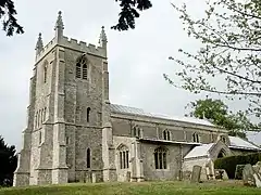The limestone Grade II listed church is dedicated to Saint Mary and dates from the 12th century, being restored in 1875 and 1892.[6] The western tower dates from the 12th century although it was raised in the 15th century. Inside is a 15th-century font and a black and white marble monument, with broken pediment, to Edward Barkham who died in 1724. One hundred yards (91 m) south of the nave is the remains of a 14th-century stone cross, which is both a scheduled monument and Grade II listed.[7]