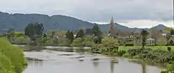 ![]() From Waingaro Rd bridge looking north down Waipā River to Ngāruawāhia Point bandstand, the Waikato (coming from right) and the Hakarimata Range in the background (19 September 2012) | |