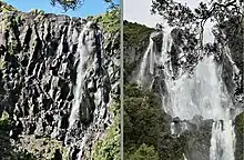 Wairere Falls, the highest waterfall in New Zealand's North Island,[1] plunges 153 metres (500 feet) in two steps over the Kaimai escarpment.[2]