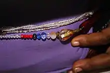 The purpose and meaning of waist beads are individual to the wearer, but may represent personal beliefs or cultural heritage, often expressed through the choice of colors and materials.[1] In many cultures, the purpose of waist beads is to signify the beginning of womanhood and to represent fertility. Waist beads are often given to a young woman by her mother to mark her transition into womanhood and her sexuality. Each culture's beliefs determine whether the beads are only intended to be seen by the woman's husband or not.[13] In some cultures, there is a belief that waist beads have a sexual aspect to them and can help attract a partner. They are also believed to help develop a woman's curves and slim her waist because they do not stretch.