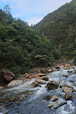 After skirting the small settlement of Waitawheta, the river flows through the increasingly narrow Waitawheta Gorge before reaching the Karangahake Gorge. From the Karangahake end, several spectacular walks[1] lead into the gorge - the "Windows Walk"[2] through mining tunnels in the cliff face high above the river, the Crown Tramway Track (partly carved into the rock), and the Crown Track (also referred to as the Waitawheta Pipeline Walk),[3] which leads further into the gorge and to the Dickey Flat campsite. The Dickey Flat campsite is also accessible via Dickey Flat Road.