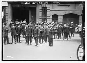 The 1912 New York City waiters’ strike began on May 7, 1912 at the Belmont Hotel and was the first general strike for waiters and hotel workers in New York City history. That day over 150 hotel workers walked out as a sign of protest against their poor working conditions. The strike was organized by Joseph James Ettor and Elizabeth Gurley Flynn of the Industrial Workers of the World (IWW) in conjunction with the Hotel Workers' International Union.[1][2] At the height of the strike there were 54 hotels and 30 restaurants and other establishments without their staff. This amounted to 2,500 waiters, 1,000 cooks, and 3,000 other striking hotel workers.[3] The strike continued through the rest of May but police began reprimanding protestors, making many of them go back to work. The strike officially ended on June 25, 1912.[4]