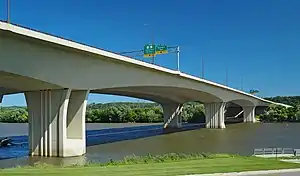 The Wakota Bridge is a ten-lane bridge carrying Interstate 494 over the Mississippi River between South St. Paul and Newport, Minnesota, United States. It was completed in 2010, replacing a four-lane span built in 1959. The name was given to the previous span in the early 1960s, and is derived from the two counties it connects, Washington and Dakota. Lunda Construction Company won the bid to build a new five-lane west-bound span, remove the existing bridge, and build a new five-lane east-bound span, which was completed in 2010. It is the widest bridge in Minnesota in number of lanes, along with the I-35W Saint Anthony Falls Bridge in Minneapolis.